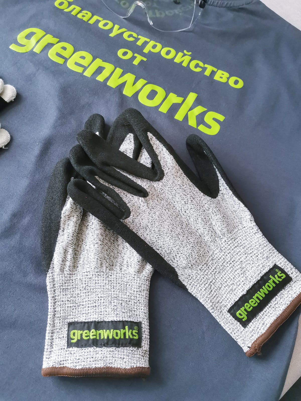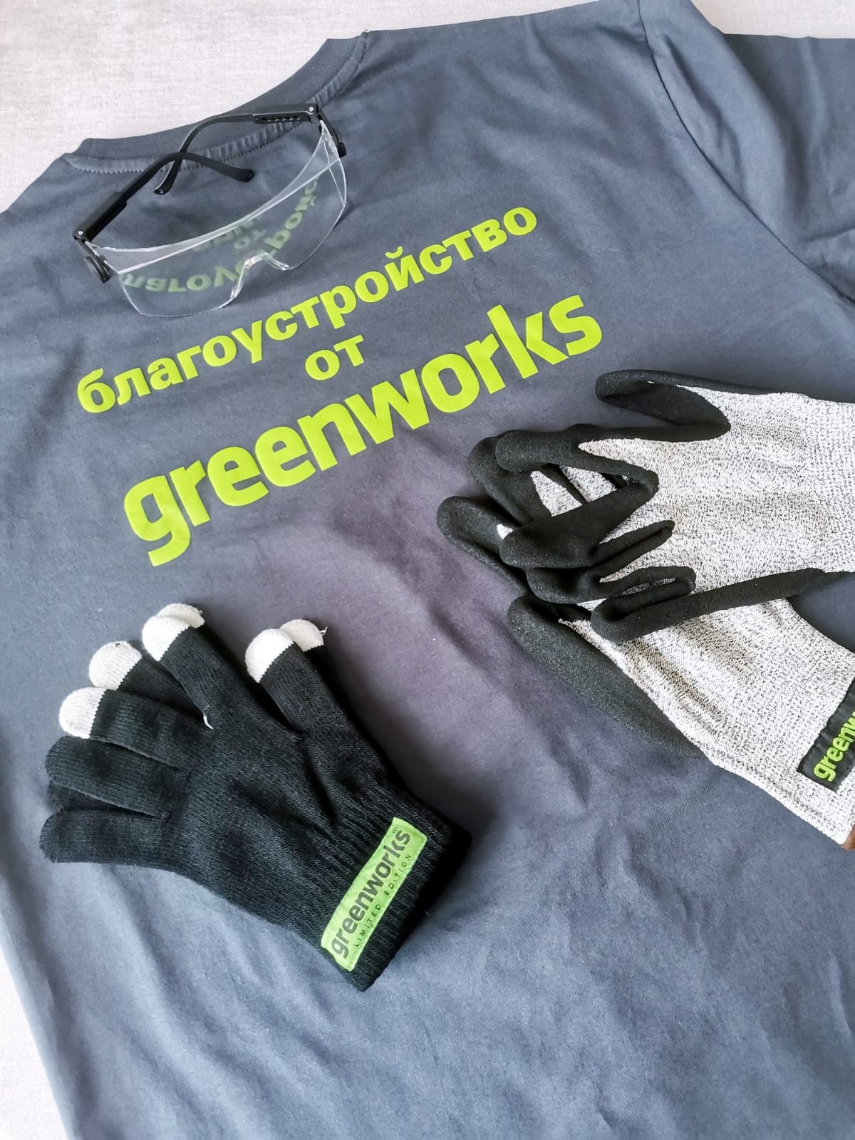 Футболка , защитные очки и садовые перчатки для компании «GREENWORKS».