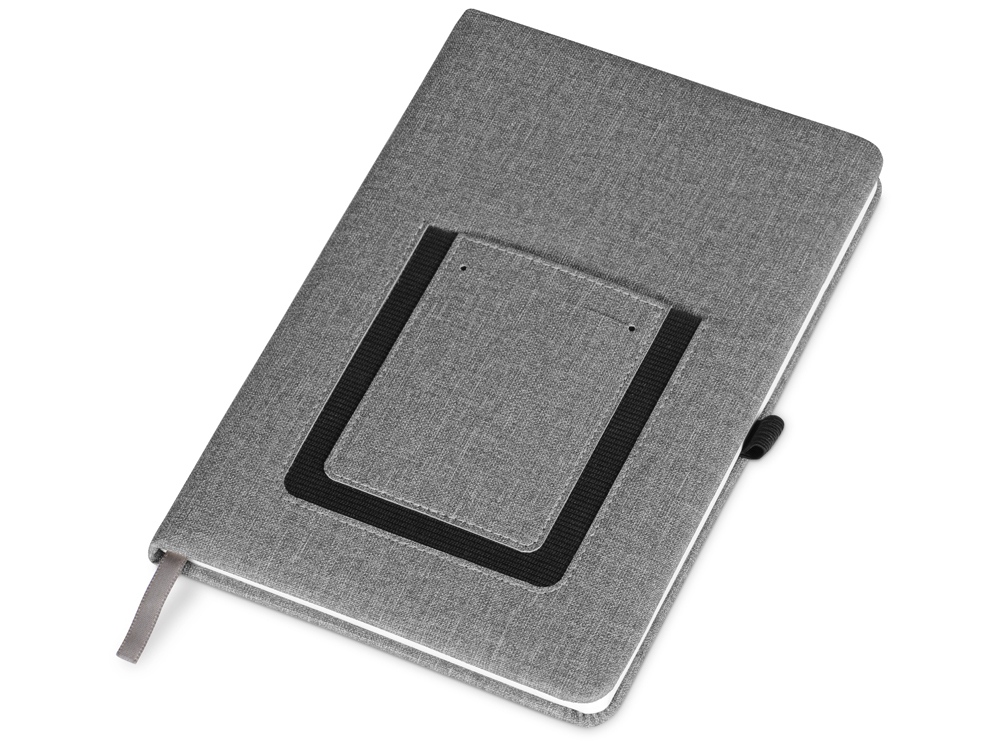 Стильный современный блокнот формата А5. На передней обложке расположен удобный карман для мобильного телефона, бумаг и визиток. Специальная подкладка обложки делает блокнот мягким на ощупь. Покрытие обложки имитирует текстуру текстиля, не скользит и отлично подходит для нанесения логотипа.