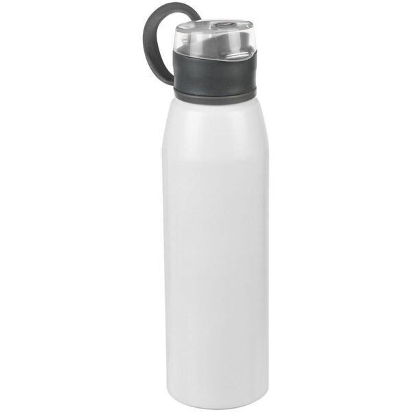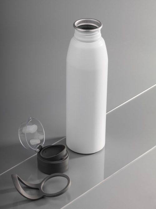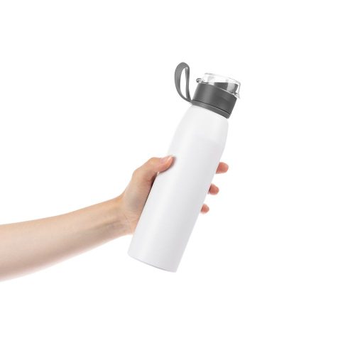 Легкая бутылка для спорта с откидной крышкой и силиконовой петлей для удобной транспортировки.