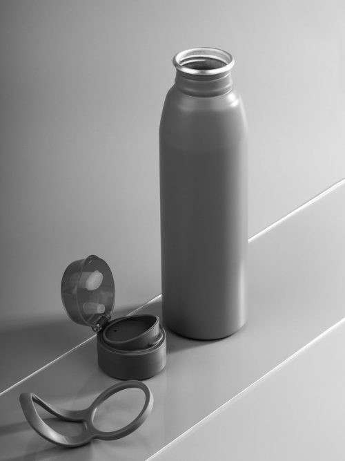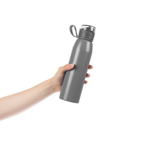 Легкая бутылка для спорта с откидной крышкой и силиконовой петлей для удобной транспортировки.