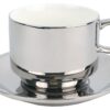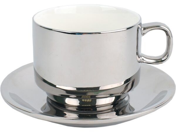 Роскошная чайная пара – отличный подарок для любителей чая. В наборе фарфоровые чашка и блюдце. Дизайн построен на сочетании жемчужного и серебристого цветов. Возможно нанесение тампопечати.