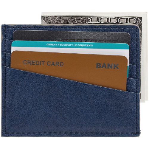 Чехол выполнен из материала Petrus, синий НН, дополнен окрашенным срезом края и внутренним карманом из серого картона. Имеет 4 отделения для кредитных карт и 1 отделение для купюр.