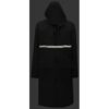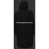 Длинный дождевик выполнен из полиэстера с водоотталкивающей пропиткой. Застегивается на молнию, поверх которой — планка на кнопках, что дополнительно защищает от ветра и промокания. Посадку капюшона можно регулировать при помощи шнурка, ширина рукава регулируется кнопкой.