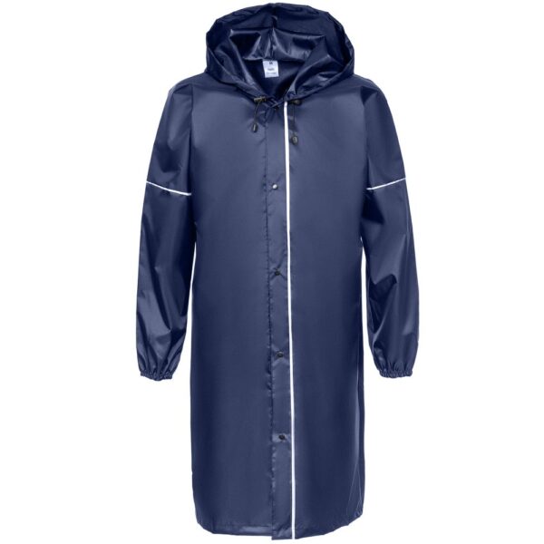 Плащ-дождевик из ткани оксфорд на кнопках с капюшоном. Световозвращающие элементы на рукавах и планке позволяют быть замеченным в темное время суток.