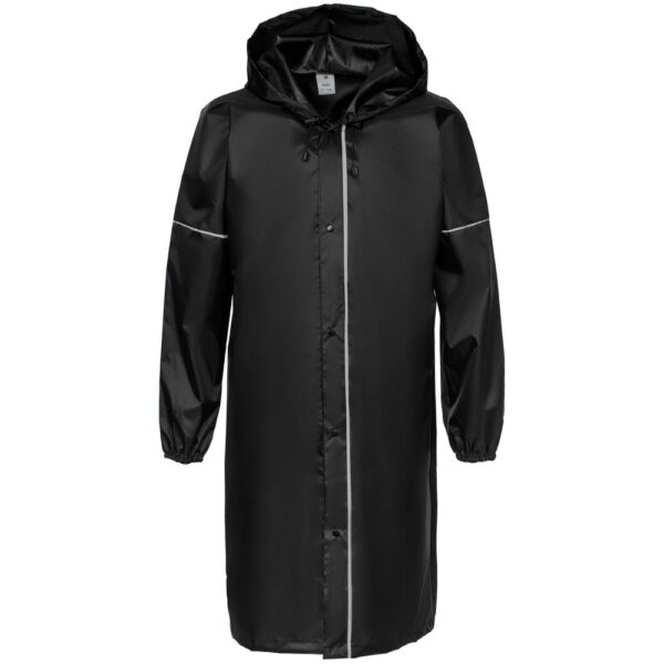 Плащ-дождевик из ткани оксфорд на кнопках с капюшоном. Световозвращающие элементы на рукавах и планке позволяют быть замеченным в темное время суток.
