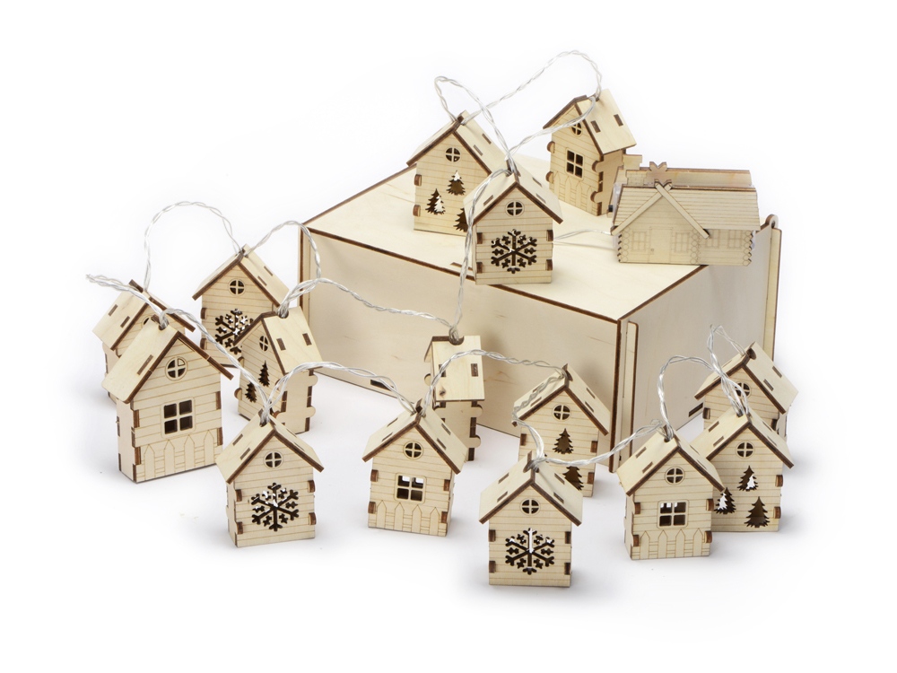 Светодиодная новогодняя елочная гирлянда постоянного свечения с домиками из натуральной березовой фанеры. Работает от 2-х батареек АА (в комплекте). Упакована в деревянную подарочную коробку со стружкой.