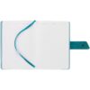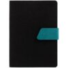 Ежедневник с гибкой обложкой, выполнен из материала La Fite, черный АА и Nubuck, цвет морской волны II, дополнен бирюзовым ляссе и хлястиком на кнопке.