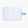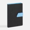 Ежедневник с гибкой обложкой, выполнен из материала La Fite, черный АА и Nubuck Touch, голубой, дополнен голубым ляссе и хлястиком на кнопке.