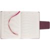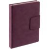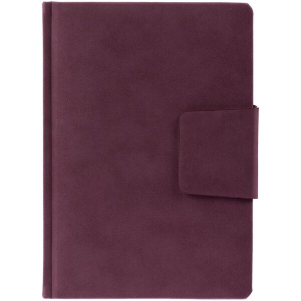 Ежедневник с твердой обложкой c поролоном, выполнен из материала Nubuck, винный SS, дополнен капталом и ляссе бордового цвета. Застежка — хлястик на магните.