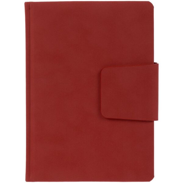 Ежедневник с твердой обложкой c поролоном, выполнен из материала Nubuck, красный РР, дополнен капталом и ляссе в цвет обложки. Застежка — хлястик на магните.