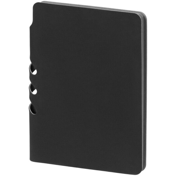 Ежедневник с гибкой обложкой выполнен из материала Soft Touch Pearl, черный АА и серого Latte (внутренняя часть обложки). Внутри корешка — специальное место для крепления ручки размером до 15х0,9 см.