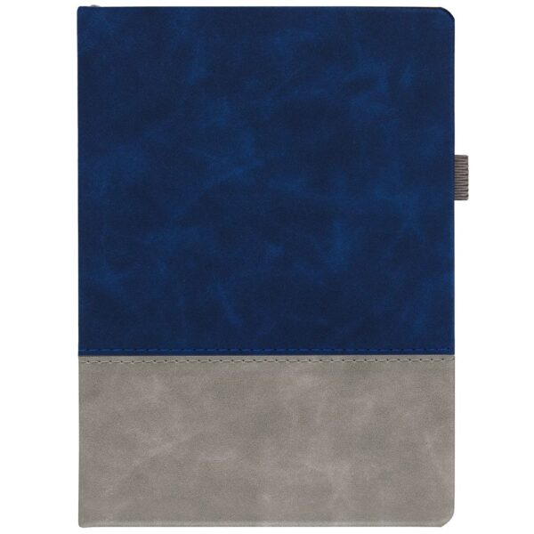 Ежедневник с твердой обложкой, без поролона, со сшивкой материалов Nubuck Touch, серый СС, и Nubuck Touch, темно-синий ХХ, дополнен двойным ляссе и петлей-резинкой для ручки.