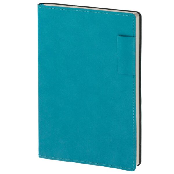 Ежедневник с гибкой обложкой, выполнен из материала Nubuck, цвет морской волны II, дополнен петлей-лейблом для ручки и ляссе в цвет материала.