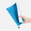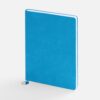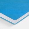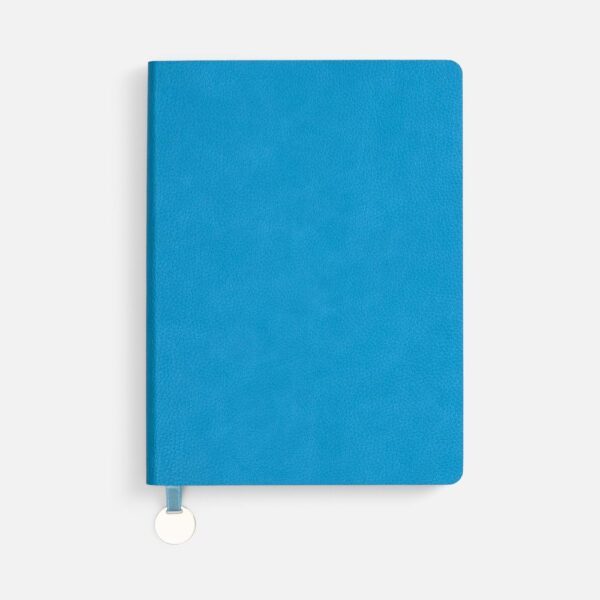 Ежедневник с гибкой обложкой, выполнен из материал La Fite, голубой JJ, дополнен ляссе в цвет обложки с металлическим шильдом.