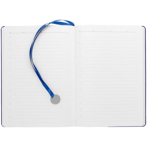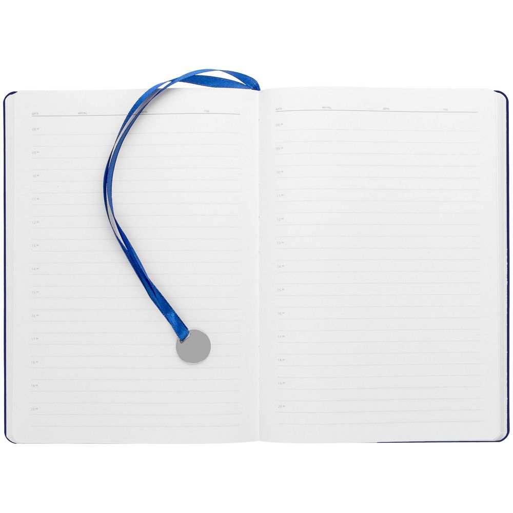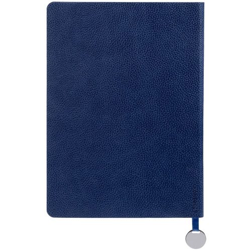 Ежедневник с гибкой обложкой, выполнен из материал La Fite, синий НН, дополнен ляссе в цвет обложки с металлическим шильдом.
