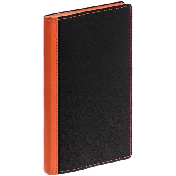 Ежедневник с гибкой обложкой выполнен из материала Nice Touch, черный АА и Soft Touch, оранжевый ОО, дополнен ляссе оранжевого цвета.