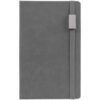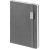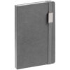 Ежедневник с твердой обложкой, выполнен из материала LaFite, серый СС, дополнен резинкой с металлическим прямоугольным шильдом и ляссе в цвет обложки.