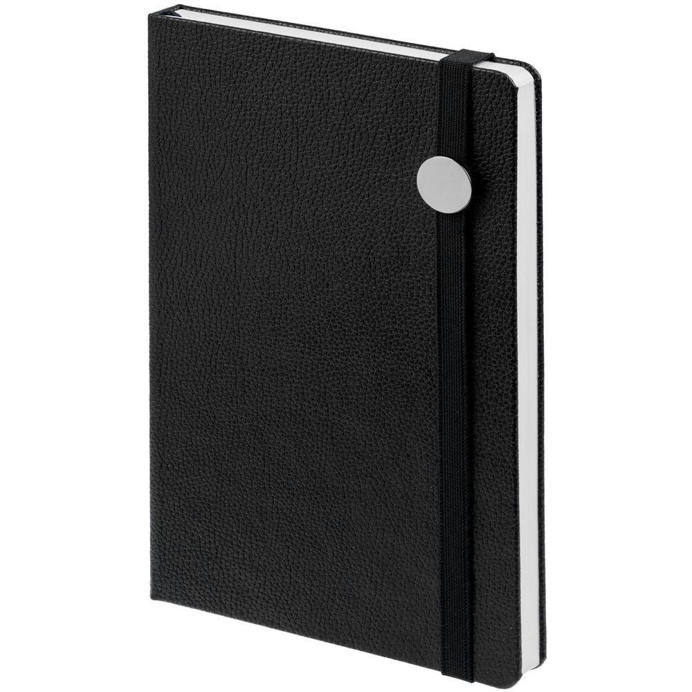 Зауженный ежедневник с круглым металлическим шильдом на резинке.