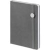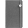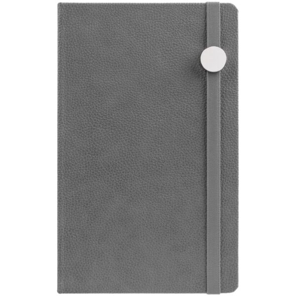 Ежедневник с твердой обложкой, выполнен из материала LaFite, серый СС, дополнен резинкой с металлическим круглым шильдом и ляссе в цвет обложки.