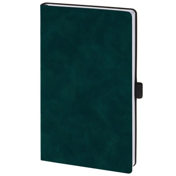 Ежедневник с гибкой обложкой, выполнен из материала Nubuck Touch, зеленый VV, дополнен ляссе и петлей-резинкой для ручки черного цвета.