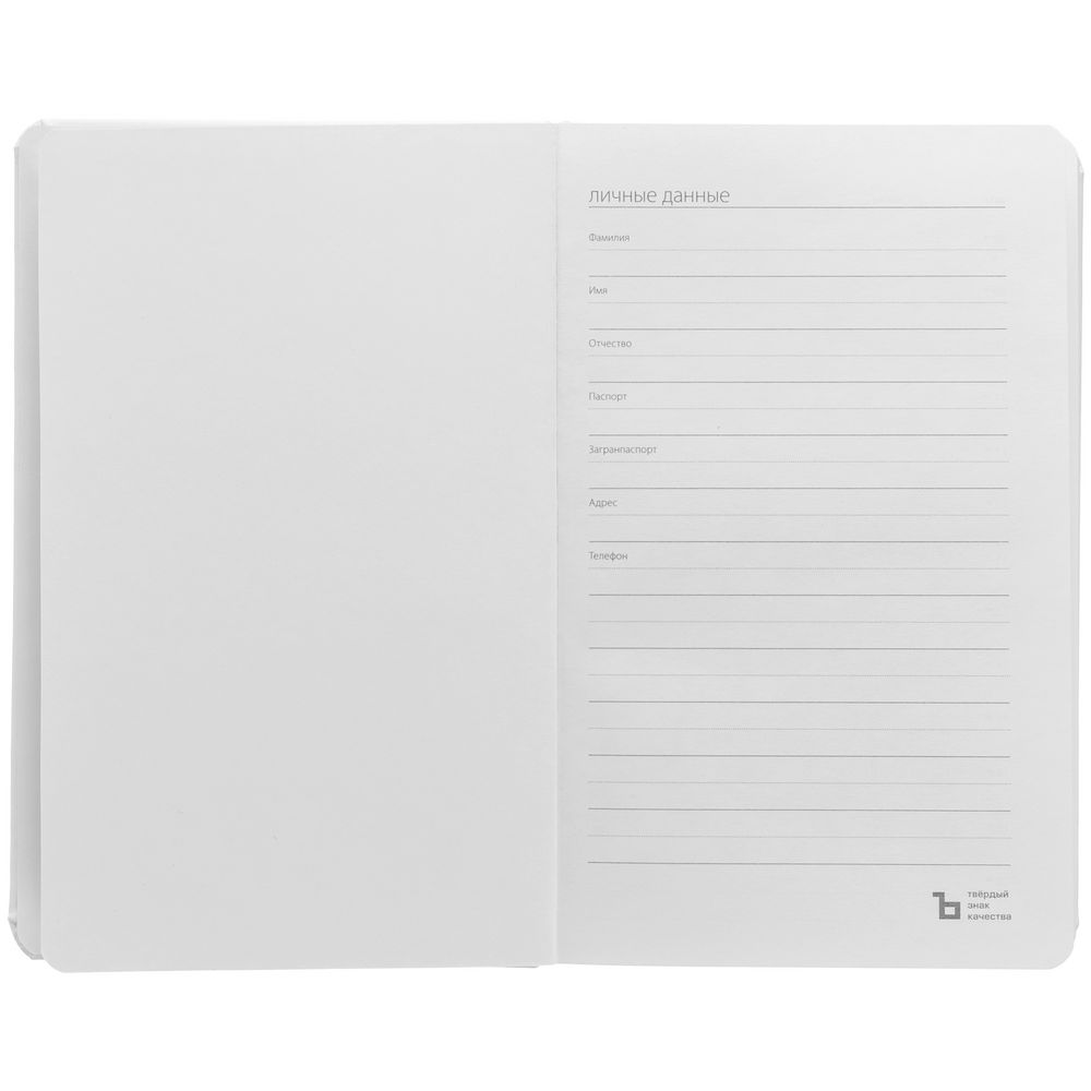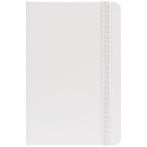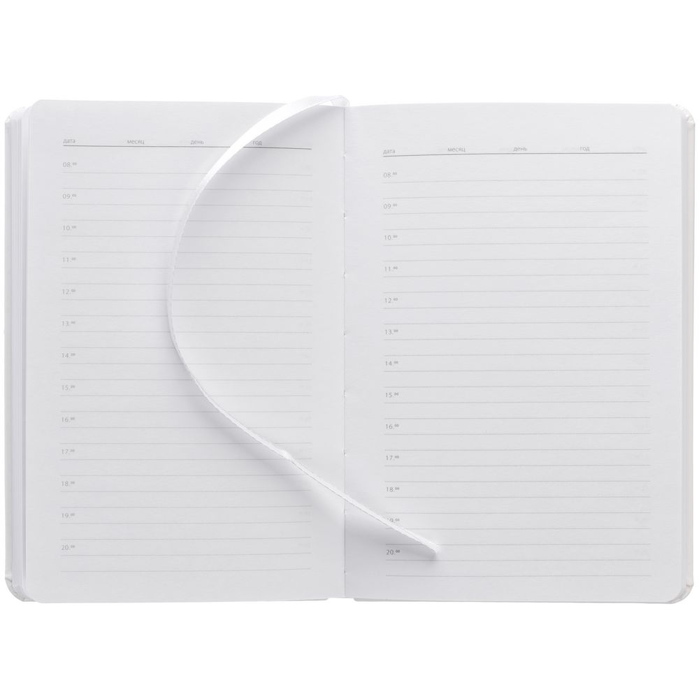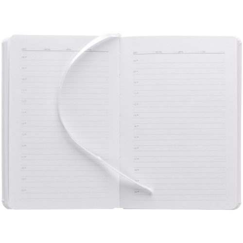 Ежедневник с твердой обложкой, выполнен из материала Waltz, белый BB, дополнен резинкой и ляссе в цвет обложки.