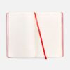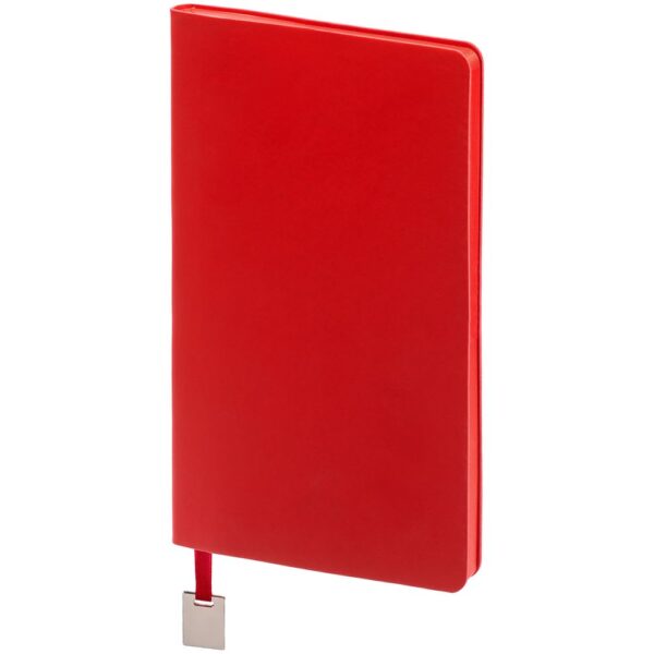 Ежедневник с гибкой обложкой, выполнен из материалов Soft Touch Ultra, красный РР, и Latte, красный (внутренняя часть обложки), дополнен ляссе в цвет обложки с металлическим шильдиком.