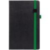 Ежедневник с полутвердой обложкой, выполнен из материала Waltz, черный АА, дополнен зеленой резинкой с металлическим шильдом и ляссе.