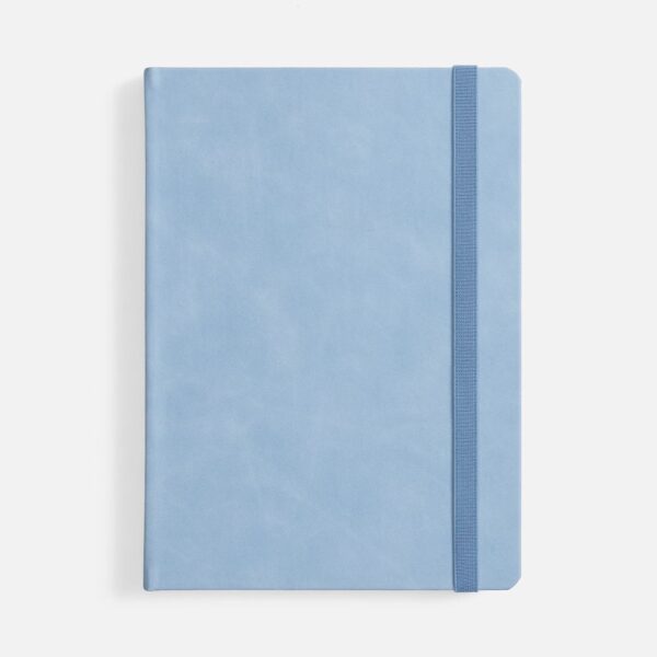 Ежедневник с твердой обложкой, выполнен из материала Nubuck Touch, голубой JJ, дополнен ляссе светло-голубого цвета.