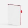 Гибкая обложка, материал обложки — Soft Touch, белый BB; внутренний материал — Latte красный РР; материал петли для ручки — Nice Touch Ultra, красный РР. Срез обложки окрашен в красный цвет.
