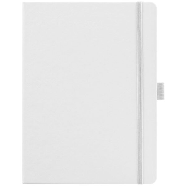 Еженедельник в твердой обложке выполнен из материала Nebraska, белый ВВ, дополнен резинкой, петлей для ручки и ляссе белого цвета.