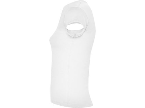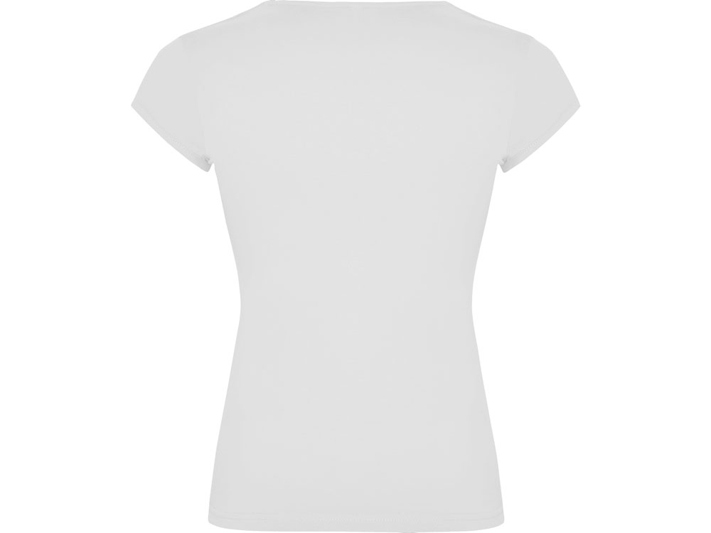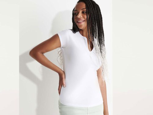 Приталенная женская футболка с круглым вырезом и v-образным разрезом спереди. Двойная отстрочка по рукавам и низу изделия.