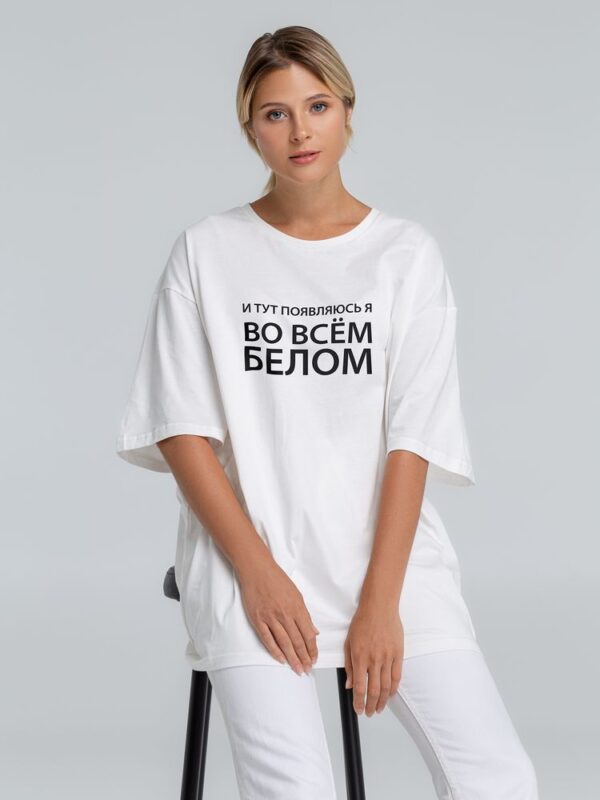 Креативная оверсайз футболка «Во всем белом» одновременно подчеркивает и чувство стиля, и чувство юмора. В этой футболке повышенное внимание к вашей персоне гарантированно.Футболка унисекс со спущенным плечом и круглым вырезом, отделанным резинкой. Высокое качество материалов: полотно джерси (кулирная гладь), особо гладкая гребенная пряжа. Принт с информацией о бренде и инструкцией по уходу за изделием на изнаночной стороне футболки.