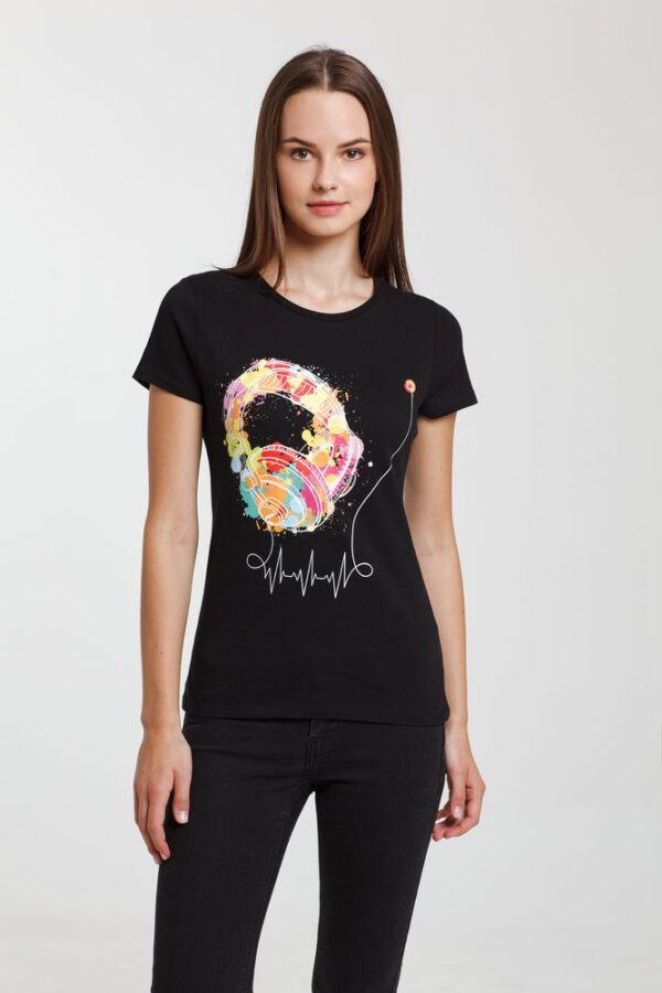 Футболка женская Feel The Beat, черная с логотипом купить оптом в Москве по низкой цене | Интернет-магазин Сувенирная продукция и мерч с логотипом компании на заказ в Москве - Идеальные подарки клиентам | TairGifts