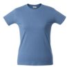 Женская футболка с уплотненными швами на плечах и двойным швом с эластаном. Четырехслойная резинка на воротнике предохраняет его от растяжения.