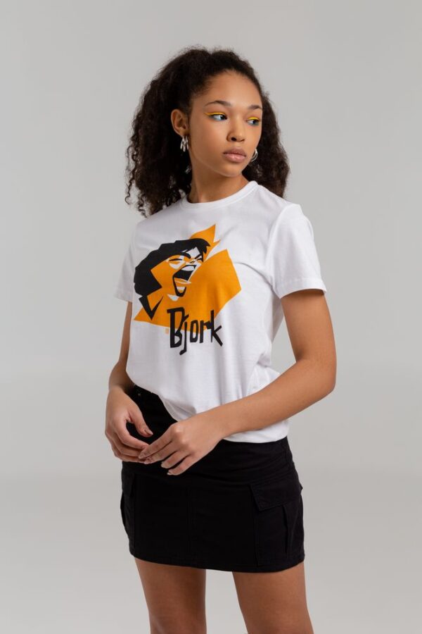 Футболка женская «Меламед. Bjork», белая с логотипом купить оптом в Москве по низкой цене | Интернет-магазин Сувенирная продукция и мерч с логотипом компании на заказ в Москве - Идеальные подарки клиентам | TairGifts