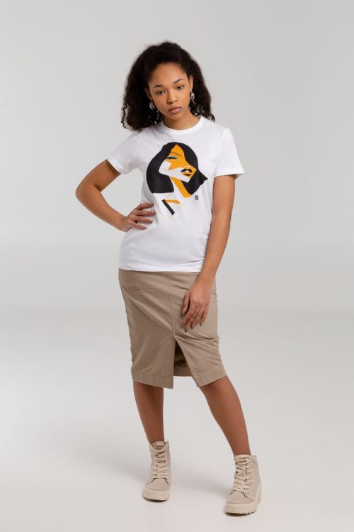 Женская футболка с уплотненными швами на плечах и двойным швом с эластаном. Четырехслойная резинка на воротнике предохраняет его от растяжения.