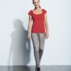 Футболка женственного приталенного силуэта с американской проймой и глубоким вырезом, отделанным обтачкой из джерси. Двойная прострочка на вороте спереди, на рукавах и по низу.