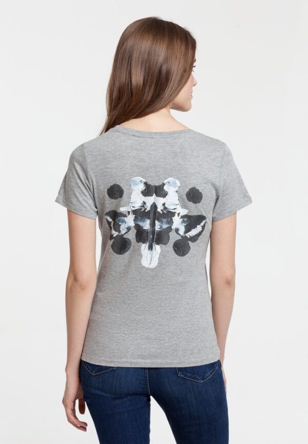 Пятна Роршаха — психодиагностический тест для исследования личности с помощью симметричных клякс. Образы, которые человек видит в кляксе, связаны с особенностями его личности. А кого видите вы?Внимание! Изображение нанесено на спину. Кроеная футболка приталенного силуэта с круглым воротом. Вырез отделан резинкой 1х1. Полотно прошло предварительную усадку.