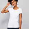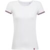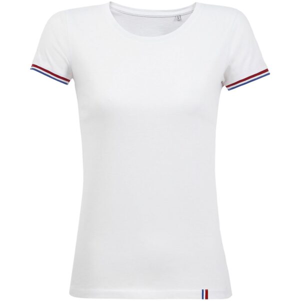 Женская футболка из 100% гребенного хлопка с круглым вырезом. Воротник и нижний край рукавов выполнен резинкой 1х1. Контрастные цветные полоски по низу рукавов.
