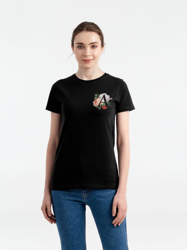 Футболка женская «Цветочная азбука: А», черная с логотипом купить оптом в Москве по низкой цене | Интернет-магазин Сувенирная продукция и мерч с логотипом компании на заказ в Москве - Идеальные подарки клиентам | TairGifts