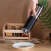 Мельница включается лишь в перевернутом положении, что позволяет снизить расход батареек и решает проблему случайного срабатывания устройства. Эргономичный корпус выполнен из нержавеющей стали и текстурного АБС-пластика.