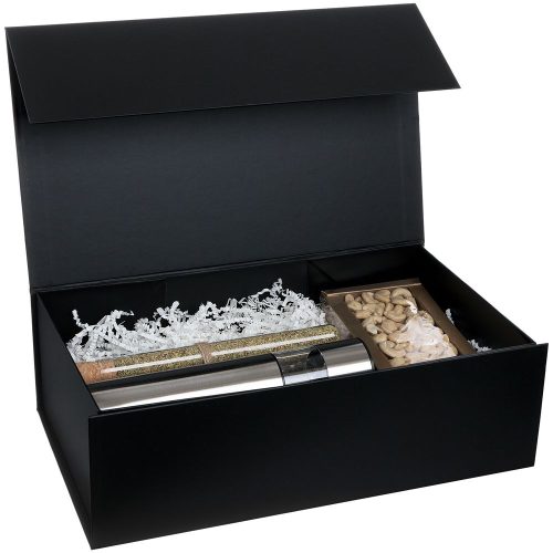 Коробка из переплетного картона, кашированного мелованной бумагой с матовой ламинацией. Крышка на магните.