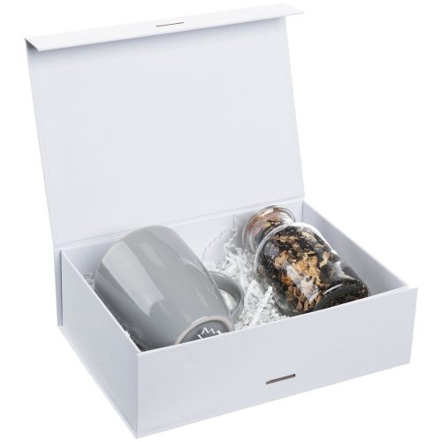Коробка из переплетного картона, кашированного тонированной в массе крафтовой бумагой. Крышка на двух магнитах дополнительно фиксируется репсовой лентой.Толщина картона 2 мм.