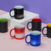 Кружка-хамелеон меняет свой облик, едва вы нальете в нее горячий напиток: черная поверхность постепенно изменяет свой цвет, становясь белой. Внутренняя часть кружки — яркая, цветная, что можно красиво обыграть, удачно сочетая ее с цветом вашего лого или гаммой изображения.