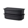 Два вместительных контейнера объёмом по 400 мл подойдут для хранения вторых блюд, закусок, салатов, гарниров и десертов. В комплект входит съёмная перегородка, которая позволит разделить один из контейнеров на 2 секции, что позволяет разместить в нём два разных блюда. Контейнеры можно использовать для разогрева пищи в микроволновой печи (при открытой крышке), а также для хранения блюд и продуктов в холодильнике.