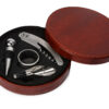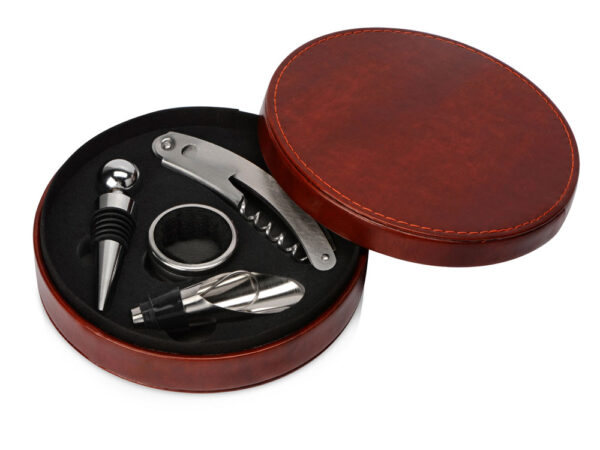 Винные принадлежности разложены в красивом круглом футляре на бархатистом вырубленном ложементе, где для каждого инструмента предусмотрено свое место. Снаружи набор обтянут искусственной кожей, точно такой же по текстуре и цвету, что и другие изделия серии Fabrizio, что позволяет составлять с ними гармоничные комплекты.
