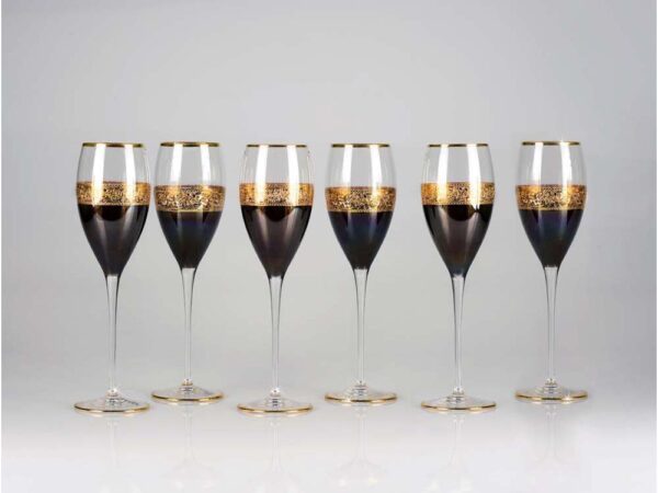 Замечательный набор бокалов для шампанского позволит отметить достижения в бизнесе в кругу партнеров и близких людей. Набор включает в себя 6 бокалов, выполненных из тонкого прозрачного и темного хрусталя с золотым орнаментом.