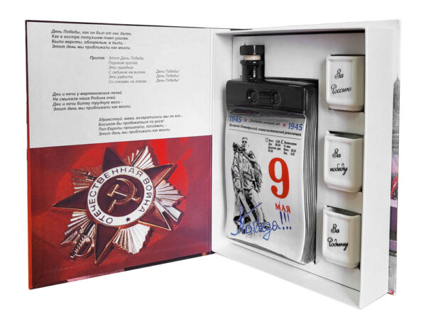 Сувениры изготовлены из высококачественной керамики и упакованы в подарочную коробку с изображением главных символов праздника. В комплекте идет штоф в виде календаря и три стопки с патриотическими тостами “За Россию”, “За Родину”, “За победу”. Этот подарочный набор станет прекрасным дополнением к праздничному столу.