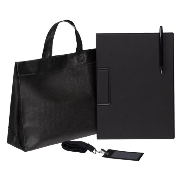 Лаконичный и строгий приветственный набор Devon Span содержит самое необходимое для нового сотрудника или участника профессионального мероприятия. Это папка-планшет и ручка — для комфортных записей и фиксации документов во время деловых переговоров или докладов, а также чехол для пропуска на ленте — для безопасности и идентификации — все в компактной легкой сумке.