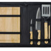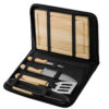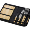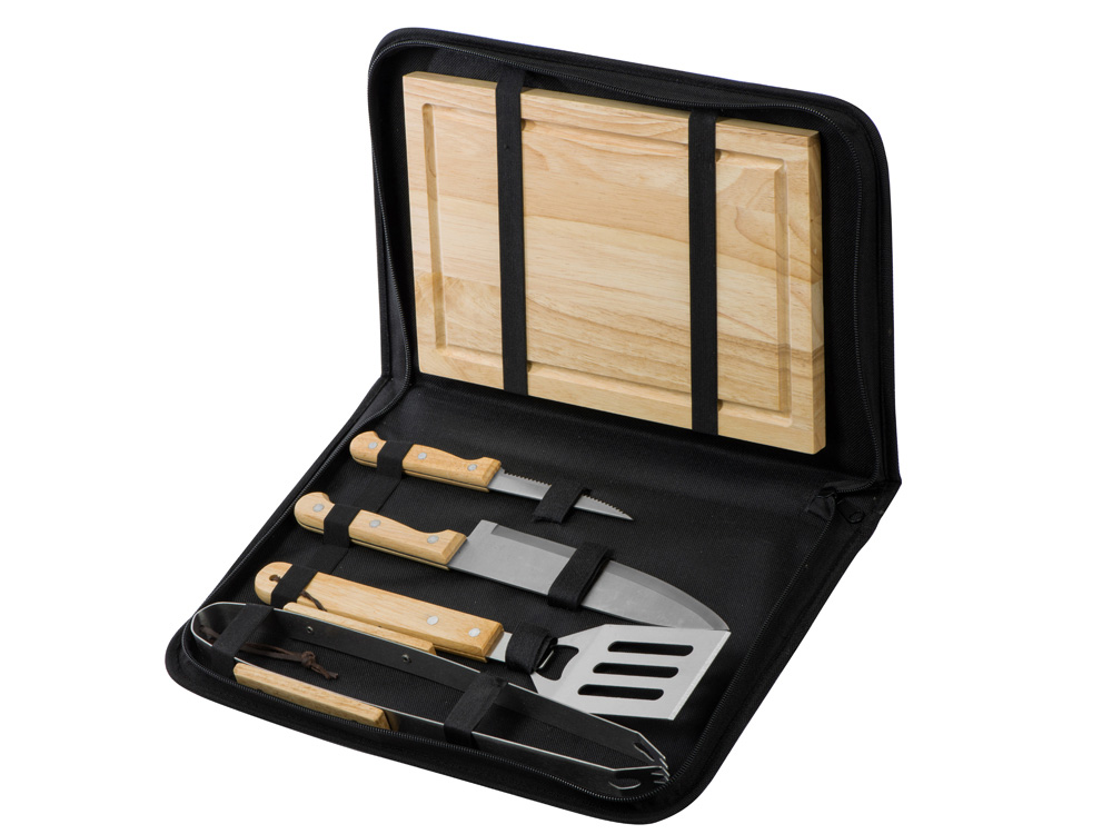 Набор из шести приспособлений для барбекю и гриля - в состав входят разделочная доска, щипцы, лопатка, нож для стейка, нож большой, а упаковывается сет в чехол из полиэстера.